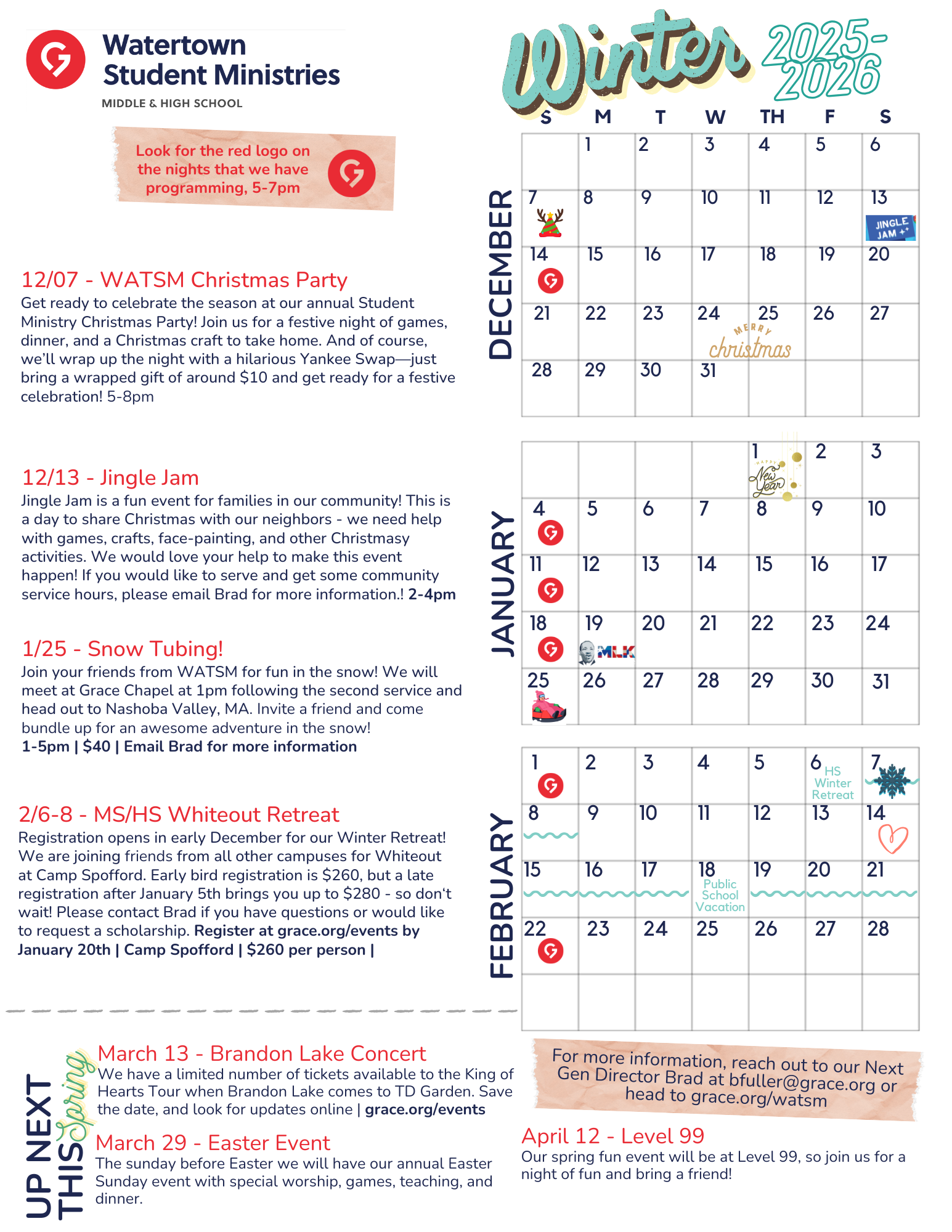 Our Watertown Student Ministries meets every Sunday at the Watertown Campus. The first Sunday of the month is usually Large Group programming from 7:00-8:30pm, with fun games, live teaching, and worship. The rest of the month is Small Group during the second service from 11:00am - 12:15pm, where we will gather together and then break out into smaller groups for discussion and connecting with each other.